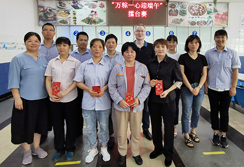 經過5輪激烈角逐,評委對所有粽子進行外觀、重量、數量等及提前提交的樣品的味道進行公平公正的評分,最終華冬英、陸鳳丹、潘淑君、韓木珍、祝順明、李雪花分獲前六名。工會主席魯小林向獲獎員工頒發了獎金并合影留念。