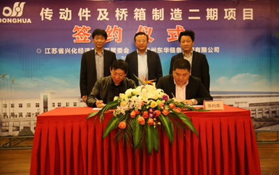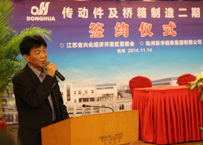 簽約儀式上,董事長宣碧華致辭。他說,東華2007年收購興化齒輪廠,至今已有8年,一直得到了興化市委、市政府和興化開發(fā)區(qū)的大力支持,使一個當(dāng)時不太景氣的企業(yè),得到了新生、發(fā)展?,F(xiàn)在不僅是鏈條行業(yè),齒輪、鏈輪、變速箱、橋箱將同步發(fā)展。今天簽約的興化這個項(xiàng)目,我們考慮了東華發(fā)展的增量和存量。增量是我們希望到2020年生產(chǎn)總量翻一番,興化的這個土地就是我們的增量空間。存量有兩塊,一是原來我們在外采購的原材料、零部件,拿回來放在興化生產(chǎn),保證質(zhì)量;二是現(xiàn)在臨平三廠區(qū)制造鏈條要退二進(jìn)三,騰籠換鳥,把騰出來的廠房做新的項(xiàng)目,比如傳動件超市、輸送機(jī)械、CVT變速箱,所以今天我們在這兒舉行簽約儀式,對東華來講是一個很好的發(fā)展機(jī)會,具有里程碑意義。
