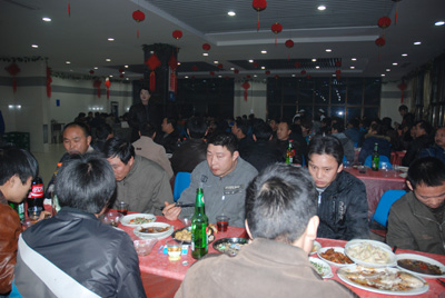 2月6日晚上,東華集團南區、新區的食堂里張燈結彩,一片歡聲笑語,550多名外地留守員工正沉浸在喜迎新春的歡樂氛圍中,這里正在為外地留守員工舉行“同吃年夜飯,歡度除夕夜”活動。