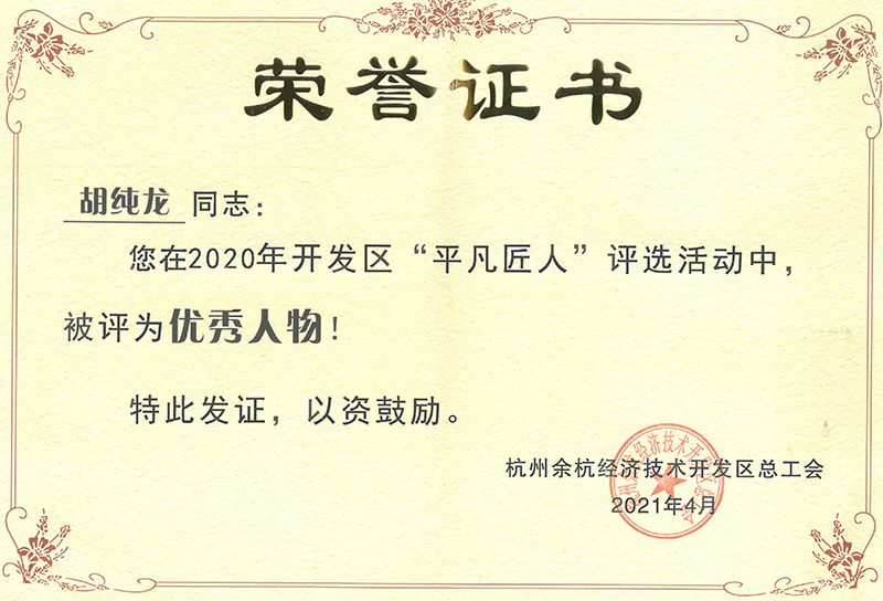 每天默默無聞在生產一線為裝配機保駕護航的他,通過不斷學習和歷練,他的維修技術不斷提升。先后被集團公司授予“技師”、“高級技師”、“先進生產工作者”、“崗位標兵”等榮譽稱號。2007年被授予余杭區“百家技能帶頭人”;2011年被余杭區“藍領技術沙龍”組織吸收為會員,同時在藍領技術沙龍組織下,他積極參加星光社區便民服務;2018年再次獲得國家級技師資格。