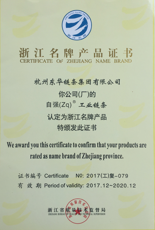 日前,東華集團(tuán)的“自強(qiáng)(Zq)®工業(yè)鏈條被浙江省質(zhì)量技術(shù)監(jiān)督局認(rèn)定為浙江省名牌產(chǎn)品,有效期自2017年12月至2020年12月。
