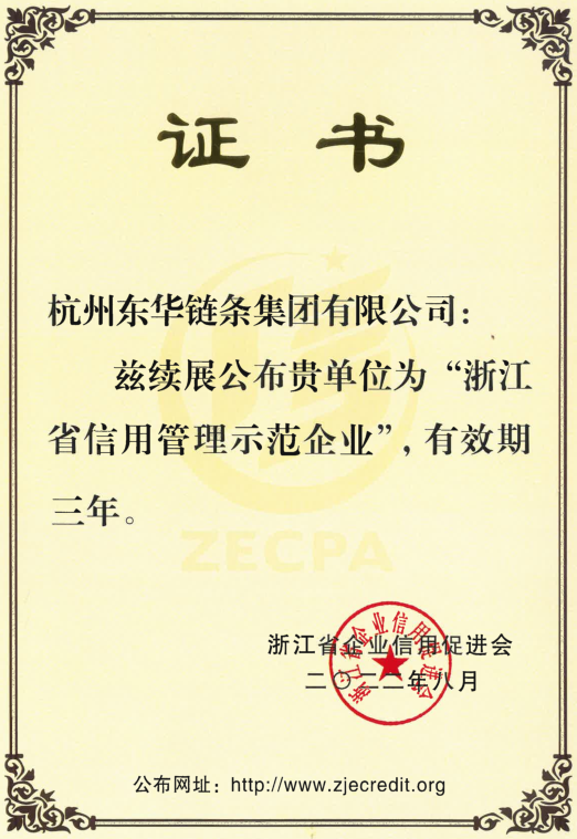 日前,浙江省企業信用促進會公布了2022年度續展“浙江省信用管理示范企業”的決定,東華鏈條集團成功續展。