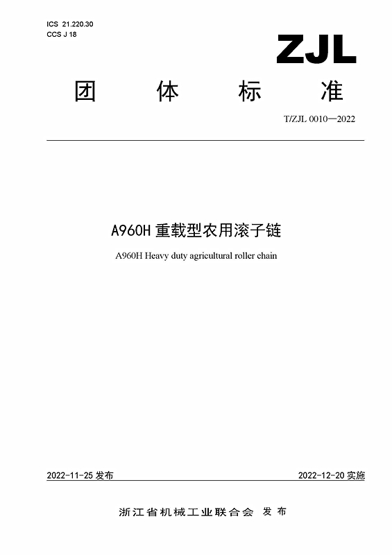 東華作為浙機聯副會長單位積極參與了浙機聯2022年首批團體標準的研制活動,牽頭制定的《A960H鏈條》團體標準為浙機聯首批團體標準之一,也是其中唯一的鏈傳動產品標準。通過制定該標準,使東華優秀農機鏈創新成果很好地實現標準化,既起到了擴展美國農機鏈標準產品規格的作用,將A960H農用滾子鏈產品推廣(推薦)給省內及國內農機主機廠家,也為東華今后更多更好地參與鏈傳動團體標準制修訂積累了寶貴經驗。