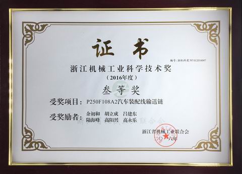 日前,在浙江省機械工業聯合會四屆四次理事(擴大)會議上傳來喜訊,東華鏈條集團所屬杭州自強鏈傳動有限公司開發的“P250F108A2汽車裝配線輸送鏈”被授予“2016年度浙江機械工業科學技術三等獎”,這是東華集團產品創新項目連續五年榮獲浙江機械科技獎,也是全省機械領域2016年度51項科技創新成果獎項中僅有的一項鏈傳動產品創新項目。