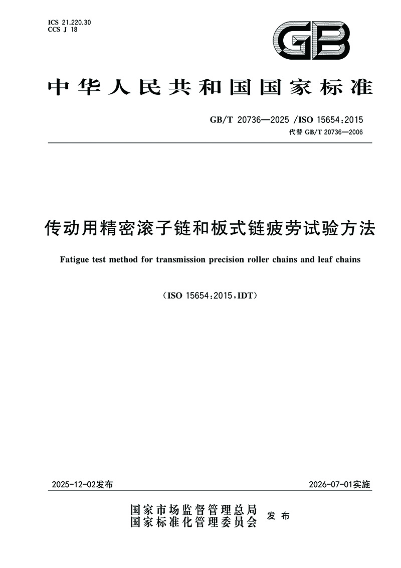 近日,國(guó)家市場(chǎng)監(jiān)督管理總局和國(guó)家標(biāo)準(zhǔn)化管理委員會(huì)聯(lián)合發(fā)布了261項(xiàng)推薦性國(guó)家標(biāo)準(zhǔn)。其中,由全國(guó)鏈傳動(dòng)標(biāo)準(zhǔn)化技術(shù)委員會(huì)歸口、東華鏈條集團(tuán)負(fù)責(zé)及參與研制/修訂的兩項(xiàng)新版鏈傳動(dòng)國(guó)家標(biāo)準(zhǔn)正式獲批,分別為GB/T 20736—2025《傳動(dòng)用精密滾子鏈和板式鏈疲勞試驗(yàn)方法》和GB/T 6074—2025《板式鏈、連接環(huán)和槽輪 尺寸、測(cè)量力、抗拉載荷和動(dòng)載載荷》。兩項(xiàng)新標(biāo)準(zhǔn)將于2026年7月1日起實(shí)施。