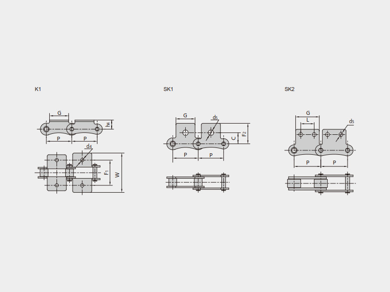 | 單節(jié)距帶K1附件 | 單節(jié)距帶SK1附件 | 單節(jié)距帶加長(zhǎng)銷軸附件 |